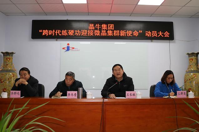 新舊之交,最是一年感懷時。12月31日下午,晶牛集團在一樓西會議室召開主題為“跨時代、練硬功、踐行微晶集群新使命”動員大會。會議由集團黨委書記王群英主持,集團董事局主席王長林作主旨報告,集團副科級以上干部、中級職稱以上人員參加會議。